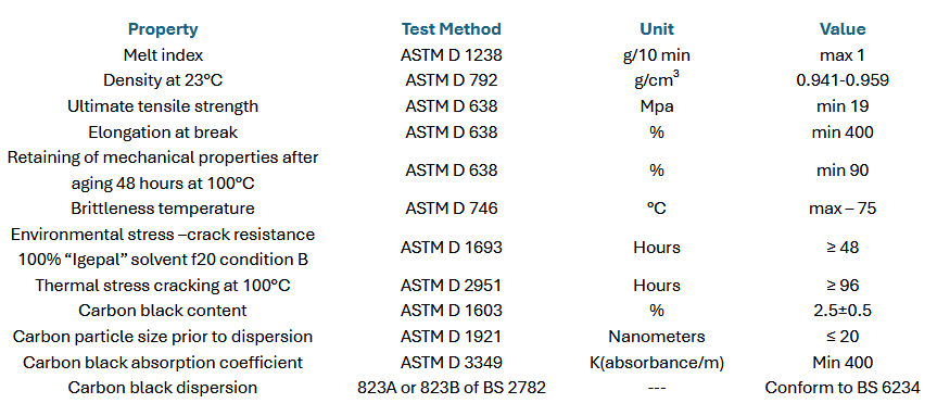 Packaging: Available in bulk, octabins, and bags. HDPE (black) 6B has a shelf life of 24 months from the date of manufacture, provided it is stored in its original, unopened packaging under clean, dry conditions at temperatures between 10°C and 30°C (50°F to 85°F). Storage conditions can impact the material’s quality and performance—extreme environments may degrade its properties. To maintain optimal quality, it is advisable to follow a First-In, First-Out (FIFO) stock rotation system.